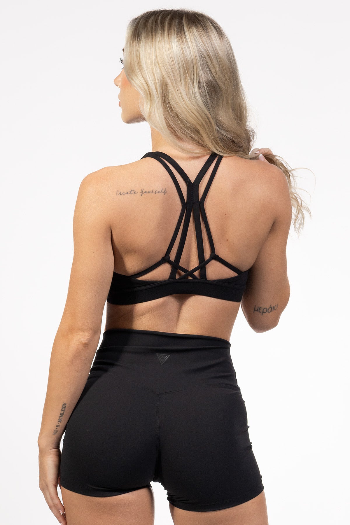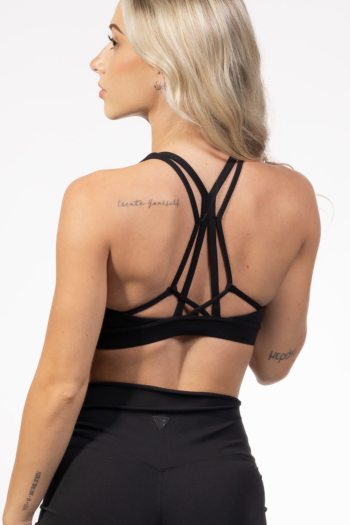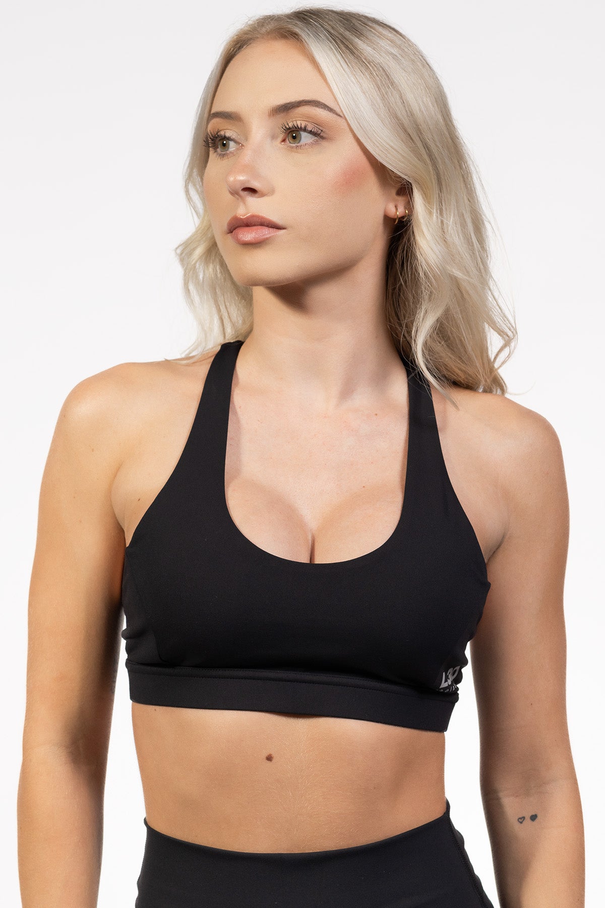Our cross-back sports bra with a scoop neckline, featuring our athletic l3o logo on the bottom band.